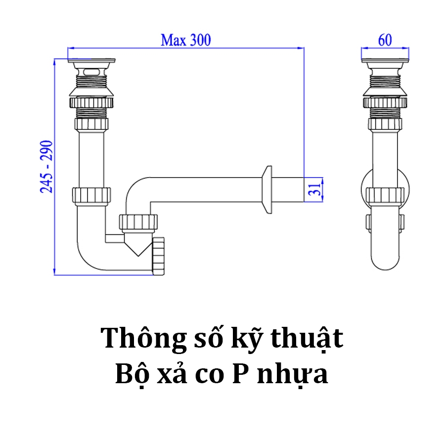 Co thoát chữ P: Được làm bằng nhựa ABS bền bỉ và thân thiện với môi trường, với các ron cao su chắc chắn. Thiết kế thông minh với ốc đổ rác, dễ dàng tháo lắp và vệ sinh